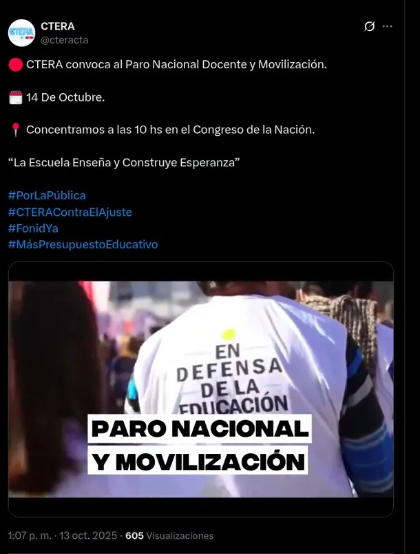A través de su perfil de X la asociación gremial llamó en las últimas horas a una concentración frente al Congreso de la Nación a las 10 de la mañana del martes bajo el lema "La Escuela Enseña y Construye Esperanza".