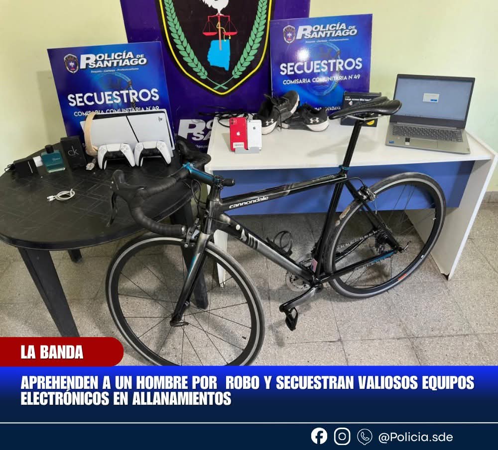 La aprehensión de un joven de 23 años, presunto autor de un robo, derivó en una serie de allanamientos en el barrio Río Dulce de La Banda, donde la Policía incautó elementos de electrónica de gran valor.