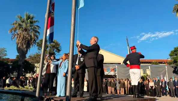 El homenaje comenzó con el tradicional izamiento de las banderas nacional y provincial, un instante cargado de simbolismo que marcó el tono de la jornada. El acto estuvo encabezado por el gobernador Elías Suárez y la intendenta de la Capital, Norma Fuentes.